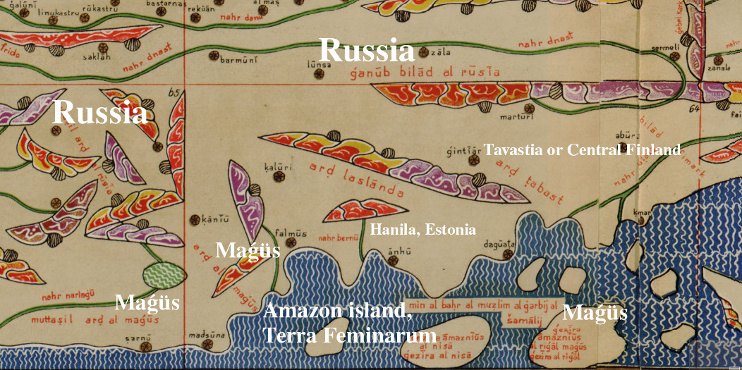 The main source other than OL to use Magus/Magi in context of Finnic peoples is medieval atlas Tabula Rogeriana made by a 12th century Arabian (Islamic) scholar Muhammad al-Idrisi for his European paymaster Roger II. Please see here an early 1900s German copy of the map from the atlas book with north at bottom. The accompanying text mentions "Medsuunah [Medynske?] being a large thriving inhabited city, it's population large and inhabitants are fire worshipping Magi" that is little vague in sense that Finnish, Lappish and Germanic peoples all worshipped or culturally deified fire one way or another. The association with Amazons or Terra Feminarum is attested elsewhere in antiquity and medieval era Finnic peoples (e.g. Adam of Bremen, Tacitus), possibly as corruption of Kvenland (Norse term for Kainuu region) misunderstood as Kvinnaland ('woman-land') or Naissaar of Estonia ('woman-island').